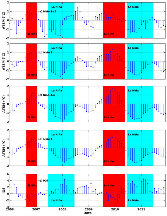 Figure 3 illustrates the temporal variability of the ENSO indicators during the period from 2006 to 2011 in the Niño regions (Figure 3a–d) and the SOI (Figure 3e), situated in the Pacific Ocean. Within this temporal span, four ENSO events were identified, comprising two El Niños and two La Niñas. The first El Niño, depicted in red, occurred in the years 2006 and 2007, while the second one took place between 2009 and 2010. In contrast, the La Niña periods, highlighted in blue, spanned from 2007 to 2008 and from 2010 to 2011. Segments where no prominent red or blue highlights are observed represent periods of neutrality. The identification of ENSO events was based on the five time series in Figure 3, in conjunction with the widely adopted classifications found in the studies of Trenberth [24,37] and Cai et al. [22], along with the ONI index available at https://psl.noaa.gov/data/climateindices/list/ (accessed on 9 April 2023).