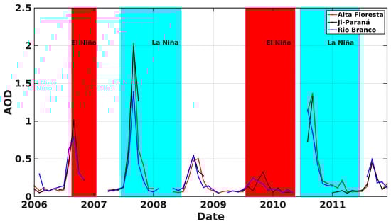Time series of aerosol optical depth (AOD) at 550 nm from AERONET with monthly averages for the sites of Alta Floresta, Ji-Paraná, and Rio Branco. The highlight in red at the background of the chart represents El Niño periods, while blue indicates La Niña periods.