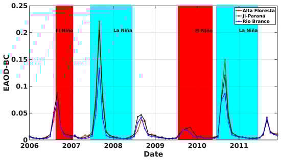 Time series of aerosol optical depth extinction for Black Carbon (EAOD-BC) at 550 nm with monthly averages for Alta Floresta, Ji-Paraná, and Rio Branco. The highlight in red at the background of the chart represents El Niño periods, while blue indicates La Niña periods.