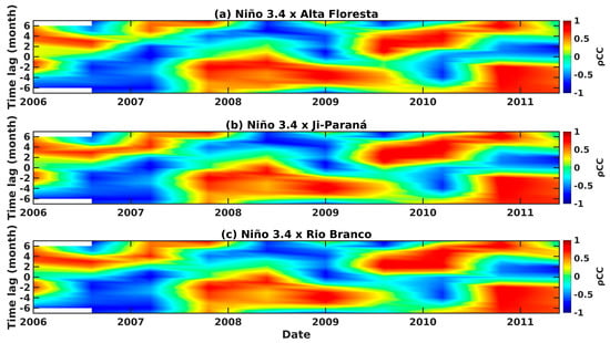 Windowed cross-correlation (WCC) analysis between the time series of SST anomalies (SSTA) in the Niño 3.4 region and the time series of aerosol optical depth (AOD) at 550 nm for (a) Alta Floresta, (b) Ji-Paraná, and (c) Rio Branco. In this analysis, a positive ρCC indicates that the Niño 3.4 ENSO SSTA series are in phase with the AOD, while a negative ρCC indicates that they are out of phase.