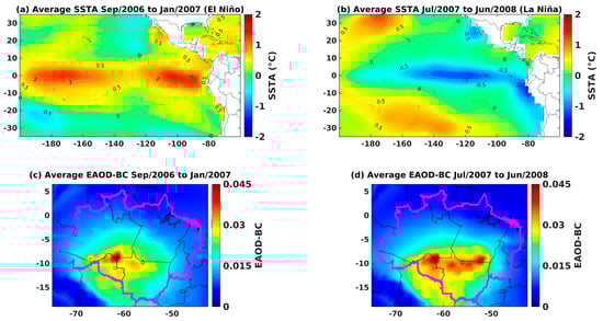 Evaluation over the Pacific Ocean showing (a) average SSTA during the period Sepember/2006 to January/2007, covering the El Niño period, (b) average SSTA during the period July/2007 to June/2008, covering the La Niña period, and average spatial distribution of extinction aerosol optical depth extinction for Black Carbon (EAOD-BC) at 550 nm during the periods (c) El Niño and (d) La Niña.