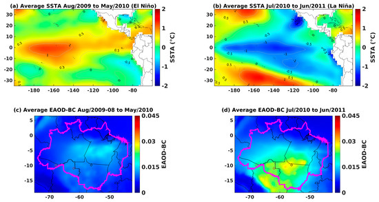 Evaluation over the Pacific Ocean showing (a) average SSTA during the period August/2009 to May/2010, covering the El Niño period, (b) average SSTA during the period July/2010 to June/2011, covering the La Niña period, and average spatial distribution of aerosol optical depth extinction for Black Carbon (EAOAD-BC) at 550 nm during the periods (c) El Niño and (d) La Niña.