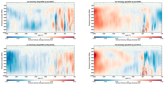 The cross-section analysis between longitude and pressure levels (hPa) within the latitudinal range of 10° and −10° showcases anomalies in vertical velocity (ω anomaly, ωA) measured in Pa/s for the following periods: (a) Sepember/2006 to January/2007 encompassing the EN-0607 event, (b) July/2007 to June/2008 encompassing the LN-0708 event, (c) August/2009 to May/2010 encompassing the EN-0910 event, and (d) July/2010 to June/2011 encompassing the LN-1011 event. Negative values of ωA indicate intensified upward activities, whereas positive values of ωA signify intensified subsiding activities.