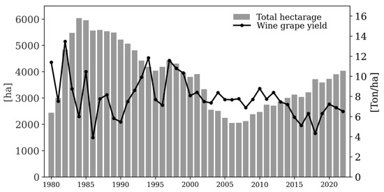 Total hectarage and winegrape yield in the Mediterranean region of Northwestern Baja California during 1980–2022. Data sources: [4].