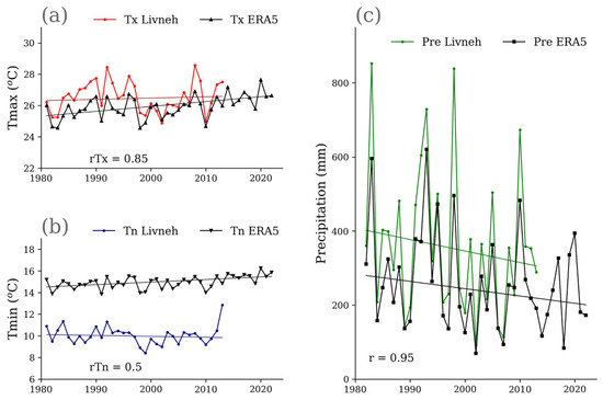 Growing season temperature and winter precipitation. (a) Maximum and (b) minimum temperatures (Tx, Tn) of the growing period (April–October) and (c) winter precipitation (November–April). The correlations (r) between Livneh’s observations and ERA5 reanalysis time series are found below in the figure. All correlations are statistically significant with a confidence level of 95%.