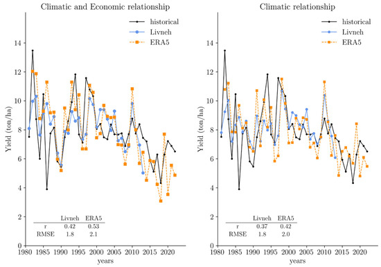 Annual winegrape yield for Baja California wine region. The black line represents the observations, the blue line is for the regression model using Livneh’s observations (1981–2013), and the orange one is for the ERA5 (1981–2022). Regression models with economic and climatic variables (left), and regression models with climatic variables only (right). The correlations (r) between the observation and reanalysis series and the root mean square error (RMSE) are found below in the lower part of the figure.
