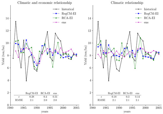 Also, regression models were set for the RCMs forced with ERA-Interim and the ensemble mean (forced with the GCMs) in the baseline period (Figure 5). The correlation coefficients in this example were lower, and the RMSE remained similar in comparison with Livneh and ERA5 models in Figure 4, possibly because ERA-Interim has a much lower spatial resolution than ERA5 (75 km vs. 32 km approximately). Although the RCMs capture the historical mean yield, the models do not simulate the interannual variability in the winegrape yield well. It is important to highlight that in Figure 5(left), the winegrape yield is better represented when the economic variables are added to the model. For example, at the end of the 1980s, the models reproduced a drop in grape yield, as observed in the historical data. Moreover, it is important to clarify that the ens of the GCMs is not expected to capture the interannual variation, as the chronology of the GCMs does not correspond to those of the observations. This time series was added to the figures to see the simulated mean yield and its trend relative to the RCMs forced with ERA-Interim, e.g., [1].