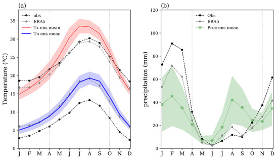 Annual cycle of (a) maximum and minimum temperature, and (b) precipitation for the 1981–2005 period for Livneh observations, ERA5 reanalysis, and the mean ensemble of the models forced by the GCMs. The solid-colored lines represent the ensemble mean, and the shaded areas indicate ±1.5 standard deviations (σ) across the ensemble member. The winegrape growing season (April–October) and the winter season (November–April) are marked with gray vertical lines in (a) and (b), respectively.