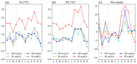 Monthly changes in the ensemble projections for the NF and IF relative to the ensemble mean during the evaluation period (1981–2005) for (a) maximum temperature (Tx), (b) minimum temperature (Tn), and (c) precipitation (Pre). The growing season (April–October) is marked with gray vertical lines in (a,b) and the winter season (November–April) in (c).