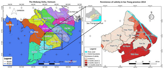In addition, details of the maps of soil types, depth of alum formation, water salinity, and duration of water salinity in 2015 were obtained from the Department of Agriculture and Rural Development of Soc Trang province for performing the land evaluation. The land-use map of the study area in 2015 as well as the saline intrusion maps in 2010 and 2015 were analyzed using data from the Department of Natural Resources and Environment.