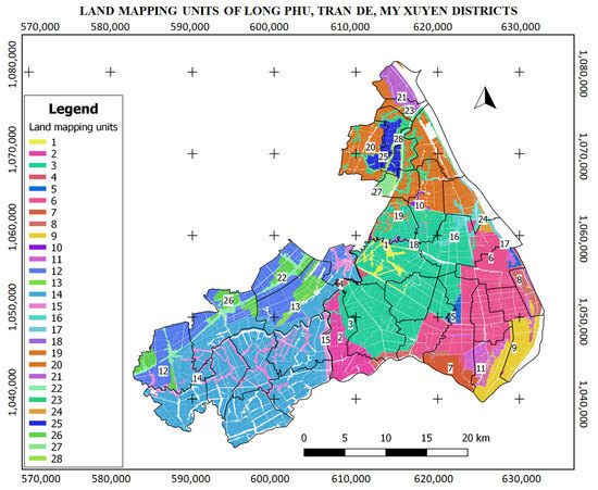 Land mapping unit (LMU) maps were created by utilizing the Union technique to analyze maps according to attributes such as soil, depth to the occurrence of acid sulfate soil (ASS), water salinity, and water salinity duration for three districts in Soc Trang province (Long Phu, Tran De, and My Xuyen). The districts’ LMU map was divided into 28 LMUs as in Figure 5.