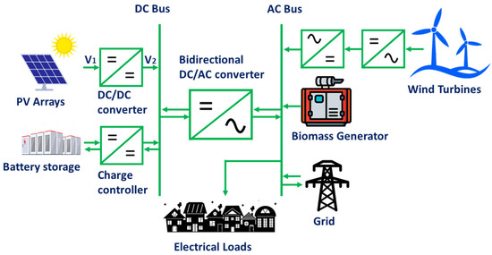 The scenarios can be defined by sizing and hybridizing the solar photovoltaics, wind turbines, biomass energy generators, and battery banks with respect to the load type and size, as shown in Figure 2. Biomass generators and battery banks in this study cover the base load and renewable energy intermittency in the grid-tied and off-grid configurations, respectively. Therefore, the simultaneous operation of battery storage and biomass generator systems is impermissible, which means that when a grid-tied scenario is considered, the grid replaces the battery bank, and the possibility of power exchange with the grid is evaluated.