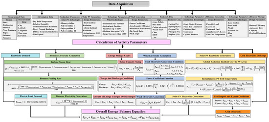where is the hourly generated electricity from solar panels. is the hourly generated electricity from wind turbines. is the hourly electricity generated from the biomass generator. is the hourly purchased electricity from the grid. is the hourly sold electricity to the grid. is the hourly discharged electricity from batteries. is the hourly charged electricity to the battery. is the hourly electricity demand that should be met at the time step of . t is the time step in hours. The overall modeling flowchart of the activity parameters is depicted in Figure 3, while the detailed calculation methodologies are explained in the Supplementary Materials (See Sections S1–S5).