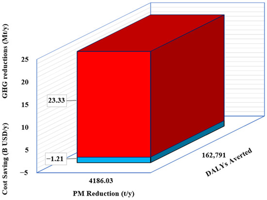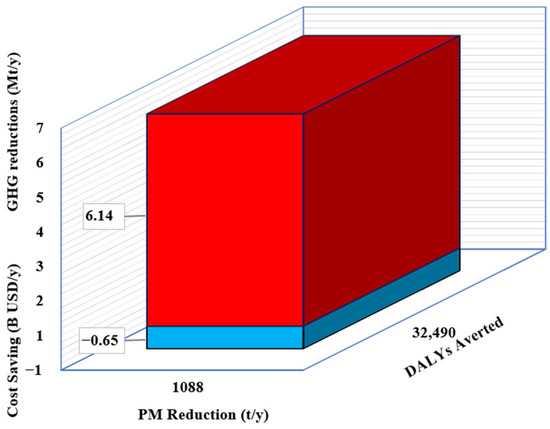 Based on the avoided emissions indices, the project’s breakeven can be recovered in 17 years without considering co-benefits and in 7 years considering the co-benefits. As a result, the project has higher NPV and lower marginal abatement cost considering co-benefits, as shown in Table 2. The substantial enhancement of the cost–benefit analysis stems from the highest population density and PM2.5 index among Indonesian provinces of the capital city, Jakarta. The health and economic co-benefits depicted in Figure 6 include 32,490 averted DALYs and 652.8 million USD/y of healthcare savings, as shown in Table 2.
