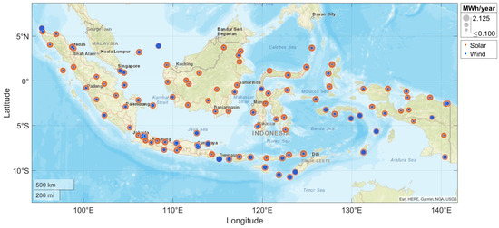 The regional impact assessment was explored based on two criteria. Firstly, finding the best location to harvest solar and wind energy is the main activity parameter to obtain the integrated environmental–health–economic co-benefits. In this context, the developed model was employed to estimate the annual electricity production from the 1 kW installed capacity of solar PV and wind turbines throughout the covered 112 measurement fields from all the provinces of Indonesia. Figure 7 demonstrates the study’s covered locations and the potential of the annual solar PV and wind production. It is observed that, although the solar PV output potential is high in all provinces, wind electricity can be harvested efficiently in specific locations.