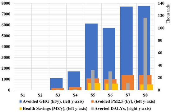 The higher population density, GRP, and PM2.5 exposure indices are expected to drive S8 to higher co-benefits achievements, as demonstrated in Figure 8, which compares all the intervention scenarios. In addition, Table 1 and Table 2 show the input and output comparison indices of S7 and S8, considering the 4 GW installed solar PV plant, respectively. The slightly higher supply of renewable energy in S8 stems from the better solar irradiation potential in East Java, while this supply difference can justify the slightly higher reduction in GHG and the cost–benefits analysis without considering the co-benefits in S8. However, considering the co-benefits, the remarkable indices between the two scenarios in Table 2 directly reflect the higher population density, GRP, and PM2.5 exposure index in East Java, as reported in Table S7 in the Supplementary Materials (See Section S8). Furthermore, this can be measured using the ratio of the averted DALYs to the annual generated electricity from HRES, which is the 4 GW installed solar PV plant. The ratios for S7 and S8 are 1.54 and 14.75, which means that due to the higher population density, GRP, and PM2.5 exposure index in East Java, a one annual gigawatt-hour can attain an averted DALYs of 14.75. These ratios can be compared with the 0.80 reported by the authors in an earlier contribution for Ulaanbaatar city in Mongolia [39]. However, it is worth noting that the solar irradiance potential, baseline mortality function for different diseases, population density, GRP, and PM2.5 exposure index vary across the regions.