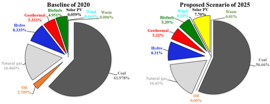 Figure 9 demonstrates the contribution of each energy production technology to the national supply mix in at baseline of 2020 versus in the scenario proposed by this study to meet the STEPS. It is observed that the total contribution of renewable energy, including hydroelectric power, to the national supply energy mix in 2020 was 18.85%, while in the STEPS it is 26.93%. On the other hand, the increased penetration of renewable energy sources has knocked out oil and decreased the coal contribution by 5.32%.
