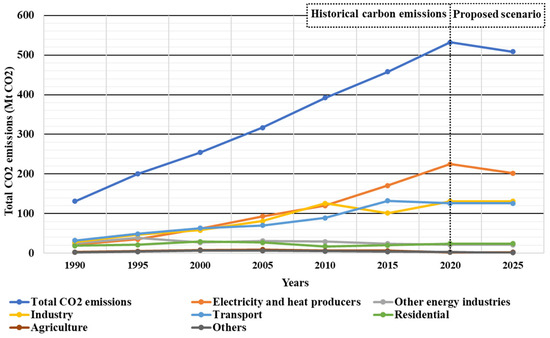 The stated policies scenario (STEPS) is a sector-by-sector assessment to tackle climate change, whereby Indonesia is committed to the sustainable development scenario of the Paris Agreement to limit the temperature below two degrees Celsius. This includes increasing the contribution of renewable energy to the national supply energy mix to 23% and 31% by 2025 and 2030, respectively, and reducing 41% of greenhouse gas (GHG) emissions by 2030 [10]. The Indonesian baseline data of 2020 were collected from IEA’s data explorer [11], and include the contribution of energy production per technology and historical carbon emissions per sector, as depicted in Figure 9 and Figure 10, respectively.