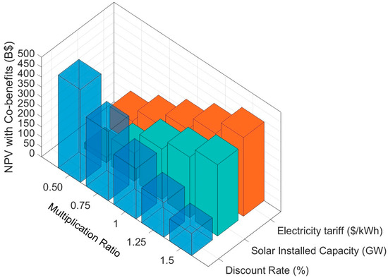 This study employed the developed methodology to assess the integrated environmental–health–economic co-benefits associated with the committed STEPS. To this aim, the feasible intervention scenarios of S4, S5, S7, and S8 were consolidated in one scenario, reflecting the STEPS, and compared with the baseline data of 2020 to find the associated co-benefits. The total installed capacity of solar PV, wind turbines, and biomass generation in various provinces throughout the country are 11.5 GW, 0.1 GW, and 0.2 GW, respectively. This generates an annual renewable energy production of 23.78 TWh, which supplies a total demand of 24.63 TWh. The proposed installation capacities of the HRES and the demand of this scenario align with the projected demand escalation of 2025 and the solar plus scenarios presented by the IEA [36]. However, the report attempted to evaluate the STEPS commitments from the perspective of tackling short-term power system challenges, focusing on transmission and distribution infrastructure. In this study, the proposed installation capacities of the HRES tend to highlight the quantifications of the attainable co-benefits. Figure 11 shows the integrated environmental–health–economic co-benefits of the STEPS based on the conducted technological and regional impact assessments. On the other hand, the NPV with co-benefits is the primary metric used to detect the attained co-benefits. This has been plotted in Figure 12 versus the major affecting parameters of discount rate, solar installed capacity, and electricity tariff. The multiplication ratio shows the percentage change in the affecting parameters, whereas 1 indicates the default parameters applied in the STEPS scenario. The applied discount rate is 6.46%, solar installed capacity is 11.5 GW, and the electricity tariff is 0.0925 USD/kWh. It is observed that the electricity tariff is the parameter that enhances NPV the most, followed by the discount rate, and solar installed capacity, sequentially.