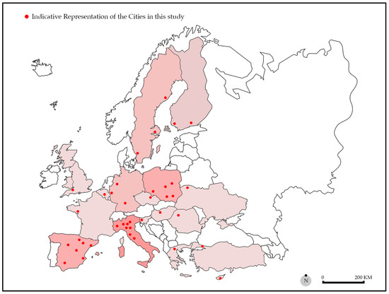 This study systematically analyses all indicators selected by cities belonging to the first cohort of pilot cities of the NZC project—Bristol (U.K.), Budapest (Hungary), Cluj-Napoca (Romania), Istanbul (Turkey), Kozani (Greece), Kranj (Slovenia), Lahti (Finland), Leuven (Belgium), Liberec (Czech Republic), Limassol (Cyprus), Malmö (Sweden), Nantes (France), Rivne (Ukraine), Turku (Finland), and Umeå and Uppsala (Sweden)—and those selected by the cities in the following four multi-city pilot projects: 7 Spanish cities under the pilot project titled “Urbanew”, 9 Italian cities under the pilot project titled “LetsGOv”, 5 Polish cities under the project “NEEST”, and 3 German cities of the project “Co-lab” (information on these specific pilot projects is available online at https://netzerocities.eu/pilot-cities-cohort-1-2022/). Figure 2 shows a map that visually locates all the above-mentioned cities. The pilot cities were provided with a standardised set of 36 indicators, including 12 GHG indicators (such as the “total Greenhouse gas emissions per year”) and 24 non-GHG indicators (such as “Improved citizen participation” in the area of participatory governance) [2,42] (Table 1). In addition, the cities could provide their own indicators, which resulted in 127 customised indicators in total for the analysed cities [43]. It is important to note that this study solely analyses the selection of proposed indicators as, currently, no data have been submitted by the pilot cities; thus, we only have information on the preliminary selection of indicators the cities are planning to utilise to assess their pilot programme actions (which are subject to change in consecutive rounds of refinement and data submissions).