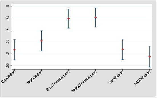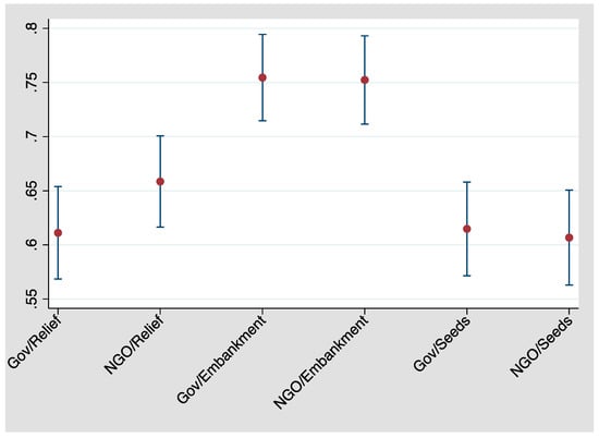 Turning to the results of the experiment, we note first that the respondents generally approved of the prompted choice across conditions, with 66 percent of all the respondents agreeing that it was the right decision and an identical proportion agreeing that they would feel safer as a result. Figure 1 (below) plots mean differences on the first dependent variable—whether the Upazila “made the right decision” according to treatment. 95 percent confidence intervals are provided around the point estimates. In terms of the choice of program, the respondents favored the embankment project over both relief and the development of water-resistant seeds, a difference that is statistically significant against the base category (p < 0.001) of whether the chosen implementor was governmental or an NGO. The obvious pattern is clear favorability for one particular policy end (of the three presented), without much regard for which institution is carrying out the providing.