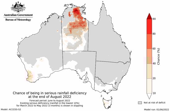 Aussie GRASS simulates pasture growth by accounting for its biophysical processes, with the Aussie GRASS map revealing areas where pasture growth is below average. Pasture growth is moderately correlated to rainfall and a significant reduction in pasture growth can be an indication of drought [29]. It is evident from Figure 7 that there is a large overlap in deficiency forecast areas and reduced pasture growth, indicating the value the deficiency forecast can have in indicating areas of potential drought concern, which may not be identifiable through solely using observed rainfall data.
