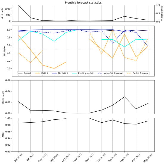 Time series of (from top to bottom) number of deficiency grid cells (expressed as % of total grid cells), PC hit rates, Brier Score, and AUC for monthly forecasts from June 2022 to May 2023.