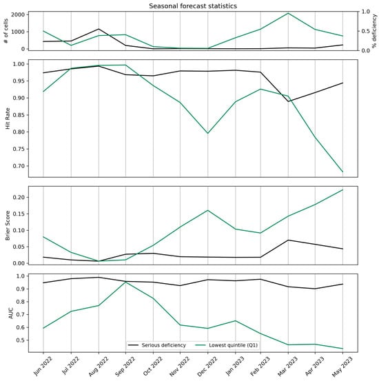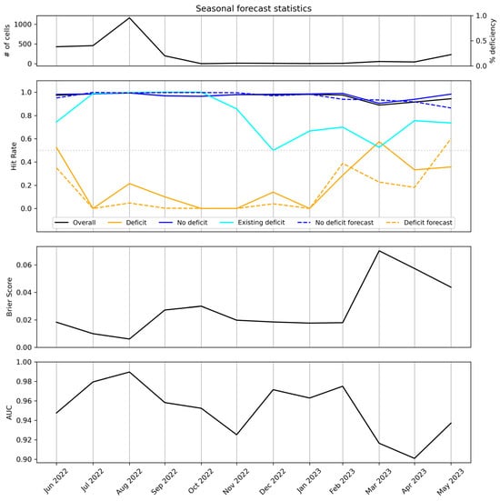 Time series of (from top to bottom) number of deficiency grid cells (expressed as % of total grid cells), PC hit rates, Brier Score, and AUC for seasonal forecasts from June 2022 to May 2023.