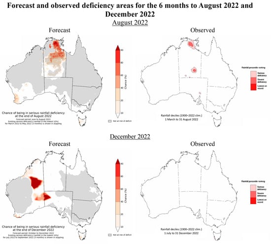 The forecast plots from two months are displayed to enable a visual analysis. A visual analysis facilitates the identification of spatial patterns and other aspects of performance that cannot be elucidated by quantitative metrics. It also helps readers to better understand the product and how it can be used. August 2022 was chosen because of its relatively good performance, while December 2022 was chosen as an example of a poorly performing month. The seasonal forecast plots are displayed alongside the observed deficiency that eventuated for those forecasts in Figure 5.