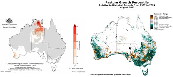 On a related note, even though areas with elevated deficiency forecast probabilities might not have ended up in serious deficiency, they may still have experienced dry conditions and drought impacts. To highlight a case of this, the August 2022 forecast is shown alongside a map from Aussie GRASS (Australian Grassland and Rangeland Assessment by Spatial Simulation) [27], a pasture growth model, in Figure 7.