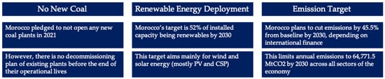 Morocco has hosted the UNFCCC COP twice, shining light on its efforts to set an example through ambitious climate targets [21]. The Kingdom’s goals under the Nationally Determined Contributions of the 2016 Paris Agreements are an emission reduction target of 45% from the baseline scenario and 52% of installed capacity being RE by 2030. Morocco also pledged to avoid investing in new coal plants at the 2021 COP26 in Glasgow, as shown in Figure 3.