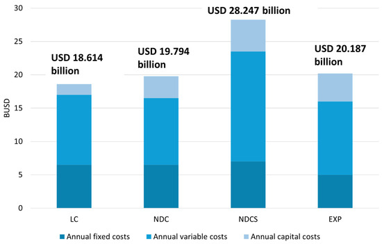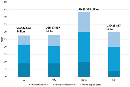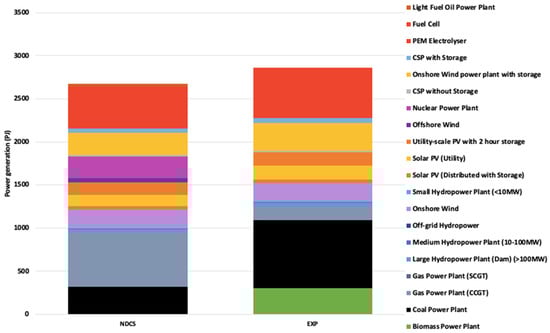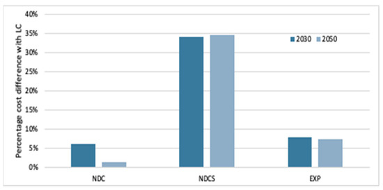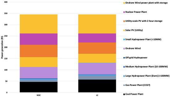 Furthermore, the NDC scenario presents a superior total installed capacity—approximately 2 to 5 GW more than the LC scenario (Figure 9) because of the inferior capacity factors associated with wind and solar energy, necessitating compensatory measures to accommodate the enhanced electrification.