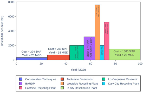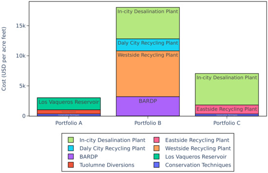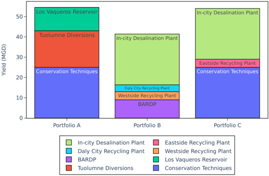 Recycling and Desalination, or Portfolio B, is composed of the Bay Area Regional Desalination Plant, the East-Side and West-Side Recycled Water Project, and the Daly City Project. Portfolio B was observed as the most expensive, containing the larger projects that require newly constructed pipes, underground reservoirs, treatment facilities, and collaboration with a network of other agencies. Portfolio B focused on the use of recycled treatment plants as an additional water source. This portfolio also looked at the increasing SFPUC’s communication and collaboration with other water agencies and districts to foster a sharing of information and innovative ideas. The Bay Area Regional Desalination Plant is a project that requires a significant amount of collaboration, and this could add resiliency to the Regional Water System by having institutions share a resource and potentially build water resources together, coming up with more holistic and innovative solutions. However, portfolio B came with the lowest yield, of 20.4 MGD, and the highest cost, of USD 18,039 per acre-foot, making it a less-than-ideal portfolio of choice from a cost–yield perspective (Figure 2).