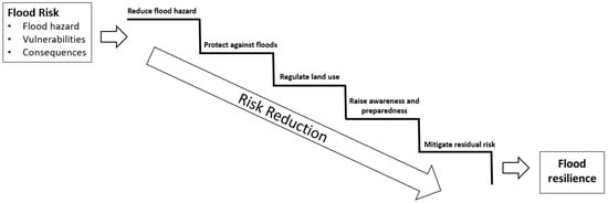The APFM definition envisions that IFM combines flood risk analysis to determine risk, flood risk assessment to weigh costs and benefits and support decisions, and the application of physical measures and policy instruments for flood risk management. It connects these diverse strands and is offered as a cascade diagram to illustrate the five categories of risk reduction [13]. A simplified version of the IFM measures is shown in Figure 1. The input to the left shows risk and at the end, the diagram shows flood resilience, which is improved as a result of the steps shown.