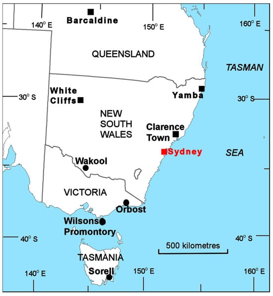 A map of SEAUS showing the locations of eight Australian Bureau of Meteorology stations with complete records of precipitation and temperature used in the study period (bold) (http://www.bom.gov.au/climate/data/ accessed on 1 April 2024). The four states, namely Queensland, New South Wales, Victoria, and Tasmania, are also delineated. Other locations mentioned in the text are also marked (italics).