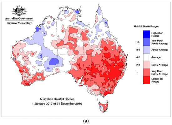 (a) Australian rainfall deciles from 1 January 2017 to 31 December 2019; http://www.bom.gov.au/climate/maps/rainfall (accessed on 1 April 2024) (b) Australian rainfall deciles from 1 September 2019 to 31 August 2023; http://www.bom.gov.au/climate/maps/rainfall (accessed on 1 April 2024).