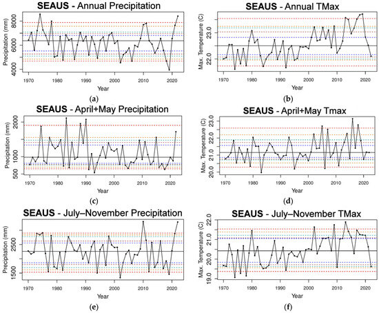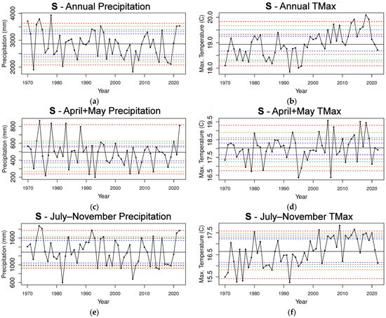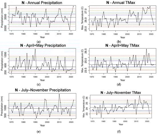 Differences in the means and variances for precipitation and TMax for SEAUS and the two northern and southern subset regions of SEAUS, referred to here as N and S, between the 1971–1996 and 1997–2022 periods are shown in Table 1. The time series of precipitation and TMax for the three areas are shown in Figure 3, Figure 4 and Figure 5.