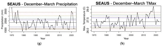 The annual total precipitation time series for SEAUS reveals that there was no trend since 1970, and the mean p-value (0.38; Table 1) between the 1971–1996 and 1997–2022 periods is not significant. However, there is clearly greater variance from 2010 to 2022 because of the many, almost equal, number of years either above or below the 50th percentile (Figure 3a). By season, the decreased precipitation variance in the April-May period between the 1971–1996 and 1997–2022 periods is significant (p-value = 0.055; Table 1). There is a clear increasing trend in the mean TMax from the 1990s, with all p-values being statistically significant or highly significant (Table 1). However, the variance is not significantly different between the two 26-year intervals. The influence of ENSO is clearly seen in December to March by the increased precipitation during both the multi-year La Niña events of the 1973–1976 and 2020–2022 periods and less so during the 2010–2012 La Niña period. The mean TMax value for the April–May period shows an increasing trend (mean p-value = 0.07; Table 1) accompanied by increased variability starting from 2010. The precipitation from July to November indicates no trend, although the two years of 2010 and 2022 above the 95th percentile are investigated later through ML to determine whether a combined contribution from IOD and La Niña are important. Again, the mean TMax value shows an increasing trend in the period from July to November except during all three La Niña periods, 1973–1976, 2010–2012, and 2020–2022, as expected. The mean TMax p-value of zero (Table 1) reveals a highly significant decrease in the mean of the 26-year 1971–1996 period compared with the latest 26-year period of 1997–2022. For both the December to March period and July to November period, there is no statistical significance in precipitation. There is a high statistical significance in the mean TMax value (p-value = 0.0006 rounded to 0; Table 1) but no statistical significance in variance.