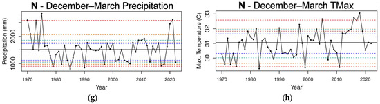 As for SEAUS, there is no trend in annual precipitation in N. Apart from the extreme rainfall in the La Niña years, there is a sharp contrast between the extremely low rainfall in 2019 at the end of the 3-year drought to the extreme rainfall in 2022, which was influenced by a strong La Niña event (Figure 4a). This is reflected in the large TMax variability from 2010 caused by the 2017–2019 drought period between the 2010 and 2022 La Niña years. However, the difference in the variance between the 26-year periods of 1971–1996 and 1997–2022 is not significant (Table 1). Also, there are no significant differences for the monthly groupings of April–May, December to March, and July–November. For the April–May period, the driest years are becoming drier, with 9 years being below the 25th percentile after the 1990s compared to 2 years prior to the 1990s. There is a clear increasing trend in the mean TMax value, especially from 2011. The difference between the 1971–1996 and 1997–2022 periods for the April–May mean TMax value is significant (p-value = 0.05; Table 1). December to March highlights the large total precipitation in the La Niña periods of 1973–1976 and 2020–2021 and an increasing trend in the TMax value, especially after 2010, with a highly significant p-value between the 1971–1996 and 1997–2022 periods (p-value = 0.007; Table 1). While precipitation from July to November shows no trend, the 4 years at the 95th percentile or above were during La Niña phases, in addition to the IOD in 2010 and 2022 being strongly negative during the July to November period, which acts as an enhancement to rainfall in SEAUS. The increasing trend in the TMax value for the July–November period is evident from the 1990s (Figure 4f), and the mean TMax value is highly significant (p-value = 0.001 rounded to zero; Table 1).
