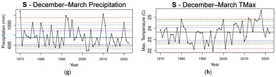 Annual precipitation in S shows a slightly decreasing trend in the median (Figure 5a), and the mean (p-value = 0.06; Table 1) has decreased significantly from the 1971–1996 period to the 1997–2022 period. An increase in the TMax value is clearly visible from 1997 (Figure 5b), and the mean is highly significant (p-value = 0; Table 1). While the mean precipitation change in the April–May period is not statistically significant, there is a marked decrease in the number of high rainfall years with no values above the 90th percentile except for 2022 (Figure 5c). Consequently, there is a significant decrease in variance in the April–May period from the 1971–1996 period to the 1997–2022 period (p-value = 0.086; Table 1). There is only a slight upward trend in the mean TMax value mainly because of the three values above the 95th percentile after 1997 (Figure 5c). These three values contribute to the upward (though non-significant) trend in the mean TMax value (p-value = 0.19; Table 1). In the December–March period, there is no statistically significant change in precipitation. However, there is a decrease in the lowest percentiles, with three yearly values below the 5th percentile after 1997 compared to zero before 1997 (Figure 5g). The upward trend in the TMax value from the late 1990s is clearly visible (Figure 5h) and is highly significant for the mean TMax value (p-value = 0.001, rounded to zero; Table 1). The pattern for precipitation in the July–November period continues with nine values at or below the 20th percentile from the mid-1990s compared to one value prior to the mid-1990s (Figure 5e), and there is a significant decrease in mean precipitation (p-value = 0.075; Table 1), which indicates that the July–November period is the main contributor to the significant decrease in the annual mean precipitation. The mean TMax value for the July–November period is highly significant (p-value = 0; Table 1).