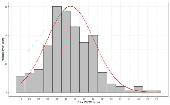 Figure 1 shows the distribution of the PDCC full/total scores with a superimposed normal curve (using the mean and standard deviation in Table 8). Although the distribution was approximately mound-shaped, Mardia’s test indicated that it deviated significantly from a standard normal curve, p < 0.0001.