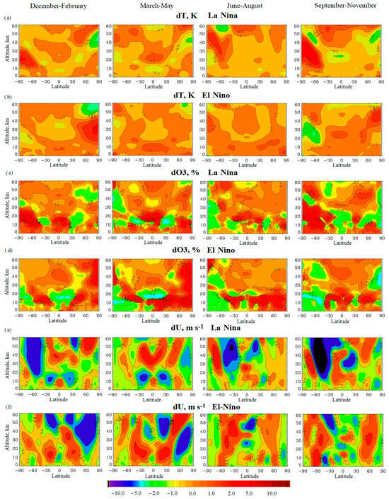 Figure 4c,d presents the vertical profiles of anomalies in ozone concentrations based on simulation results for the La Niña and El Niño scenarios. In the winter–spring period of the Northern Hemisphere (December–May) in El Niño, a decrease in ozone is observed in the tropics, and in the Arctic during the same period, ozone increases. In La Niña, ozone in the tropics increases and decreases in 30–60 N. In the winter–spring period of the Southern Hemisphere (June–November), on the contrary, in the tropical stratosphere, ozone increases, and in the Antarctic stratosphere, it decreases, especially in the spring, i.e., the ozone hole is getting deeper. In La Niña, ozone in Southern Hemisphere increases in autumn and winter and decreases in spring and summer. For the zonal wind (Figure 4e,f), it can be noted that at the border of the polar region in winter, the zonal speed in the Arctic (December–February) in the El Niño years is significantly lower than in the La Niño years, while in the Antarctic winter (June–August), the zonal speed at the polar boundary increases during the El Niño years. This means that in the Arctic, the polar vortex becomes less stable during the El Niño phase, and in the Antarctic, it becomes more stable.