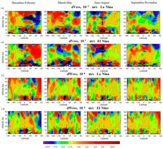 Seasonal profiles of the anomalies between the meridional (a,b) and vertical (c,d) components of the residual circulation based on the modeling results for the scenarios with La Niña and El Niño phases.