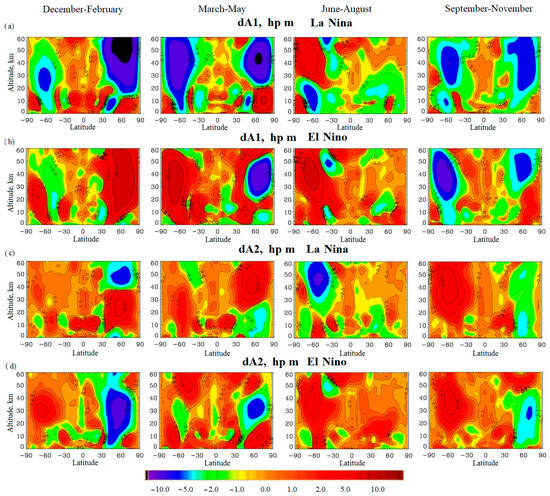 The change in the amplitudes of atmospheric waves at the polar boundary characterizes the change in their impact on the polar vortex; therefore, Figure 6 demonstrates the changes in the amplitudes of waves with wave numbers 1 and 2 in the experiments with SST corresponding to the El Niño phase and experiments with SST with the La Niña phase compared to the average values. For wave number 1 in El Niño (Figure 6b), an increase in amplitude is observed in both the Northern Hemisphere (December–February) and Southern Hemisphere (March–August) during the winter period. However, in the Northern Hemisphere, the amplitude of wave number 1 increases more strongly, especially in the lower stratosphere. Simultaneously, in the spring period, when the polar vortex is finally destroyed due to the final warming, the amplitude of wave number 1 decreases in the Northern Hemisphere, while in the Southern Hemisphere, it increases at the polar boundary. In La Niña (Figure 6a), the amplitude of wave number 1 decreases in both hemispheres, but in the Southern Hemisphere, the amplitude increases in 30–60 altitudes. For wave number 2 (Figure 6c,d), in El Niño, the amplitude decreases in the Northern Hemisphere in winter and spring at the polar boundary, whereas in the Southern Hemisphere, it increases in winter and decreases in spring. In La Niña, this amplitude in the Northern Hemisphere increases in winter and summer, decreases in 10–30 km and increases in 30–60 km in spring, and decreases in autumn. In the Southern Hemisphere, this amplitude increases but decreases in summer. Thus, it can be stated that with the change in phases of the Southern Oscillation, wave number 1 contributes more to the destruction of the polar vortex during the El Niño phase than during the La Niña phase in the Northern Hemisphere, and wave number 2 contributes more in the Southern Hemisphere than in the Northern Hemisphere.