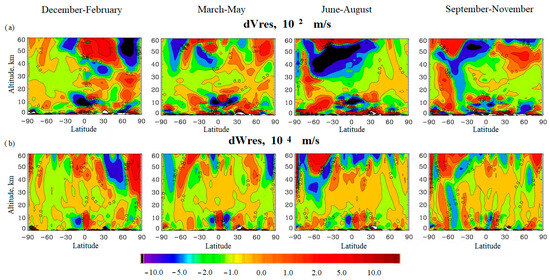 To clarify the role of changes in the BDC and wave activity in the influence of global warming on changes in temperature and ozone, we further consider the variability in the components of the residual circulation and the amplitudes of planetary waves for the beginning and end of the climatic period 1980–2020. Figure 8 demonstrates the variability in the meridional (Figure 8a) and vertical (Figure 8b) components of the residual circulation at the end of the 2010s relative to the beginning of the 1980s. In the Northern Hemisphere, the meridional flow toward the pole at the boundary of the polar region in the lower stratosphere increases in winter and spring, as a result of which the vertical speed also increases (Figure 8b), and the zonal wind increases only in the upper stratosphere (Figure 7c). As a result, ozone is reduced in the middle and upper stratosphere of the Arctic (Figure 7b). At the Antarctic border, the meridional flow toward the pole weakens during the winter–spring period (June–November), and the vertical velocity increases inside the polar region and weakens in the middle latitudes near the border with the polar region. This leads to the fact that the polar vortex strengthens (an increase in the zonal velocity at the boundary of the polar region—Figure 7c), and for temperature (Figure 7a) and ozone (Figure 7b), a tendency to decrease is formed.