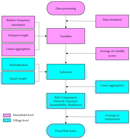 Flowchart of how the flood risk index at the village level was calculated from variables collected at the household level.