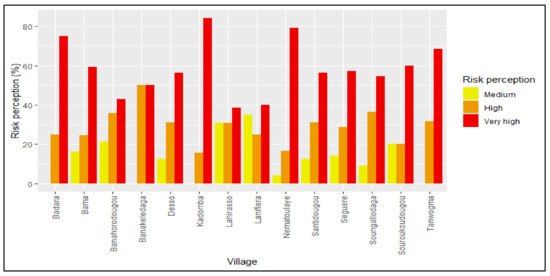 Flood exposure is high in 11 villages, very high in two villages (Seguere, village 7; Tanwogma, village 10), and medium in Bama (village 1). Distance to the river is one of the commonly used determinants in assessing flood exposure and risk [67,68]. However, there is not a distinct distance from which exposure to floods is low [69]. We observed that there was not a single factor that dominated the level of household exposure, given the different indicators (local, human, and assets exposure) that contribute to flood exposure. The Government of Burkina Faso has listed Seguere as one of the villages scheduled for relocation, due to the expansion of agricultural development, particularly for rice cultivation, facilitated by the construction of the Samandeni dam.