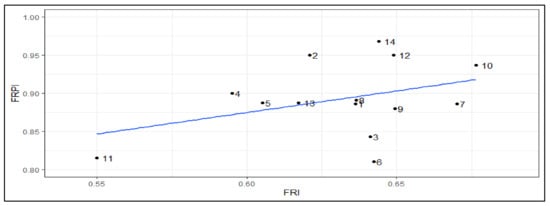 Relationship between the flood risk index (FRI) and the flood risk perception index (FRPI) for the 14 villages. Numbers denote villages: 1: Bama, 2: Badara, 3: Banahorodougou, 4: Banakeledaga, 5: Desso, 6: Lanifiera, 7: Seguere, 8: Soungallodaga, 9: Souroukoudougou, 10: Tanwogma, 11: Lahirasso, 12: Nematoulaye, 13: Santidougou, and 14: Kadomba.