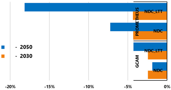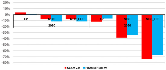 The carbon pricing mechanism plays a pivotal role in achieving large emission reductions by 2050 as it provides economic incentives to reduce emissions. At the time, several carbon pricing instruments exist that cover about 40 countries around the world. In all policy scenarios, PROMETHEUS and GCAM show increased carbon prices that drive reductions in global CO2 emissions, underscoring the crucial role of this mechanism in influencing emission reductions and accelerating investments to greener and more sustainable technology alternatives. In the CP scenario, the global average carbon price is projected to rise gradually in both models (from around USD 10 2015/tn CO2 in 2020 to USD 31 in 2050 in PROMETHEUS and further to USD 50 in GCAM), leading to a reduction in global CO2 emissions of 7% in PROMETHEUS and 12% in GCAM, indicating a limited impact on driving substantial changes in the global energy system. On the other hand, the implementation of NDC targets would lead to higher increases in the global average carbon price increasing to USD 55–80‘2015/tn CO2 in 2050 in PROMETHEUS and GCAM achieving a notable 34–39% reduction in emissions by 2050, showcasing the efficiency of climate policies and plans embedded in NDCs (Figure 3). The most pronounced results, though, are seen in the NDC_LTT scenario where the average carbon price increases to USD 125 in PROMETHEUS and USD 143 in GCAM by 2050 to achieve the national Long-Term Targets, resulting in an extensive reduction of 67–74% in global CO2 emissions in the period 2020 to 2050 and illustrating the effectiveness of the carbon pricing strategy. This economic incentive aligns with the broader goal of mitigating climate change by discouraging the use of carbon-intensive fuels and technologies, but it would be challenging to achieve net zero by 2050. The effectiveness of carbon pricing relies on being part of broader climate policies, with enhanced policy portfolios including a combination of market-based, regulatory, innovation, and informational policies, as analyzed in [29]. This includes regulations, standards, subsidies, incentives, and supportive measures. This has also been highlighted in the International Energy Agency’s scenario “Net Zero by 2050” [5], where regulatory policies are combined with carbon pricing to achieve deep decarbonization.