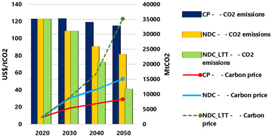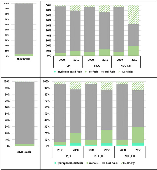 The high carbon price combined with strong national regulatory policies imposed in the NDC_LTT scenario could not achieve emission reductions higher than 75% by 2050. The analysis points out that even with a high carbon price, emission reductions cannot reach net zero mainly because of the availability and scalability challenges facing some low- and zero-carbon technologies, including CCS, hydrogen, and synthetic fuels. As the electricity sector can be fully decarbonized by 2050, clean electricity will become the most important option to reduce emissions from energy demand sectors (transport, industry, buildings). However, several end-uses in industry sector (e.g., steel, cement, chemicals) and in transport (e.g., shipping, aviation, freight transport) cannot be directly electrified so other low-carbon alternatives need to be massively deployed, including hydrogen, advanced biofuels, and synthetic fuels, to decarbonize these sectors, in line with other modelling studies [33,35]. Many of the options needed to decarbonize the demand sectors, and mainly the industry sector, involve technologies that are not yet deployed on a commercial scale, such as fuel cell technology and synthetic fuels. This indicates large challenges in accessing and adopting low-carbon technologies and innovation due to limited research and development capabilities; as such, carbon pricing alone cannot incentivize the necessary investments in clean technologies to pave the way towards net-zero and must to be combined with strong regulatory policies, e.g., technology or emission standards, fuel blending mandates, and subsidies, as shown in [29].